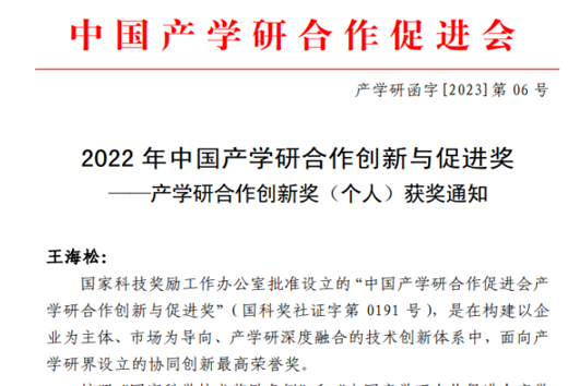 近日,中国产学研合作促进会发布了“2022年产学研合作创新与促进奖”获奖通知,经过产学研合作创新与促进奖奖励委员会评审并公示,我校williamhill威廉希尔王海松教授荣获中国产学研合作创新奖(个人)。 “中国产学研合作促进会产学研合作创新与促进奖”(国科奖社证字