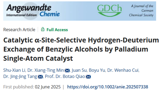近日,我校williamhill威廉希尔唐晶晶老师联合中国科学院大连化学物理研究所乔波涛研究员团队,在化学领域国际顶级期刊《Angewandte Chemie International Edition》上发表Catalytic α-Site-Selective Hydrogen-Deuterium Exchange of Benzylic Alcohols by Palladium Single-Atom Catalyst(钯单原子催化苄醇化合物α-位点选择性氢氘交换)文章。研究人员创新性地利用钯单原子催化剂,在温和反应条件下,以廉价、安全的重水为氘源,成功实现了苄醇类化合物α位点的高效、高选择性氢氘交换。《Angewandte Chemie International Edition》期刊由德国化学学会主办,以严格的学术标准和超高的专业影响力著称,该论文是我校首次以第一单位在该刊发表研究性论文,表明我校化学学科研究工作国际影响力得到了进一步提升。